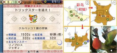 | 砂原中的彩鸟初始在8区,常逃往4区和7区(睡觉)。彩鸟本身没什么,主要是它在8区能招出土砂龙作为援军,请善用臭玉熏退其一。(我开始讨厌这种崇尚怪多力量大的鸟类了……) | ||||