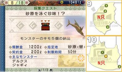 | 怪物的肝可以从砂鱼身上挖到,建议新手们出发前自带若干音爆弹,以免补给品音爆弹用光后留下某些痛苦的回忆。砂鱼大量出没在9区和10区,间歇性上跳。利 用音爆弹或是其他爆炸物可以把它们炸上来慢慢砍,也可以趁它们例常跳起时进行攻击吸引其注意力。任务物品出的几率比较小,需要耐心多砍几只。 | ||||
