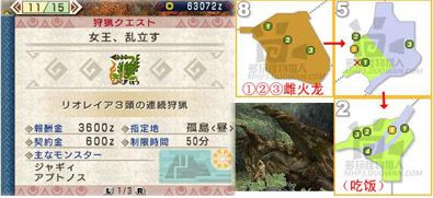 | 由于是与强敌雌火龙的3连战,出发前务必带足各种恢复药品。第一条雌火龙在8区初始,随后不久便飞往5区。之后两只雌火龙的刷新区域与动向相同,不过杀掉第一只后有预先跑去8区守候的时间。 | ||||