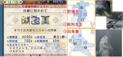 | 村★★★★★ | 14. 大型连续狩猎 | 目标:野猪王x1 眠狗龙x1 白兔兽x1(连续) | ||