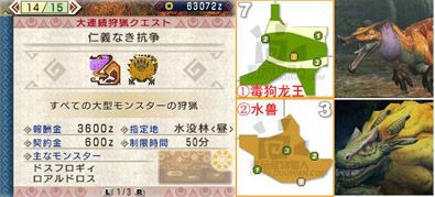 | 村★★★★★ | 16. 大型连续狩猎 | 目标:毒狗龙x1 水兽x1(连续) | ||
