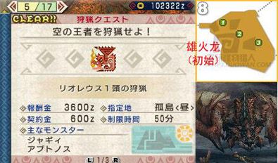| 村★★★★★ | 17. 大型连续狩猎 | 目标:青熊兽x1 雌火龙x1(连续) | ||