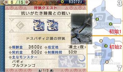 | 本次狩猎的目标是冻土3大肉(无误)。首先登场的野猪王初始7区,有向5区转移的趋势。其次出现的是7区的眠狗龙。最后是3区的白兔兽。火属性能把它们克得死死的。这种大型连续狩猎过关都会获得勇气之证。 | ||||