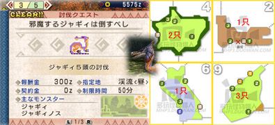 | 目标怪是5只小狗龙,瘦瘦的那种哦,出没情况如上图所示,以9区的数量最多。 |
